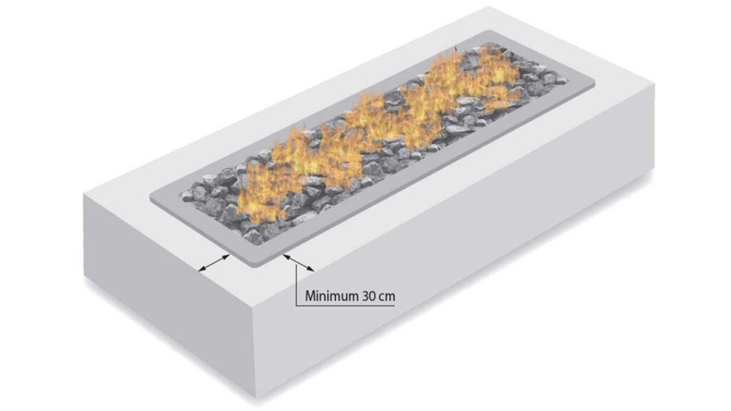 If the horizontal surface around the fire pit is joined to another horizontal or vertical surface – whether Caesarstone or another material – there must be a minimum of 30 cm between the outer edge of the fire pit (with or without lip) and the join.